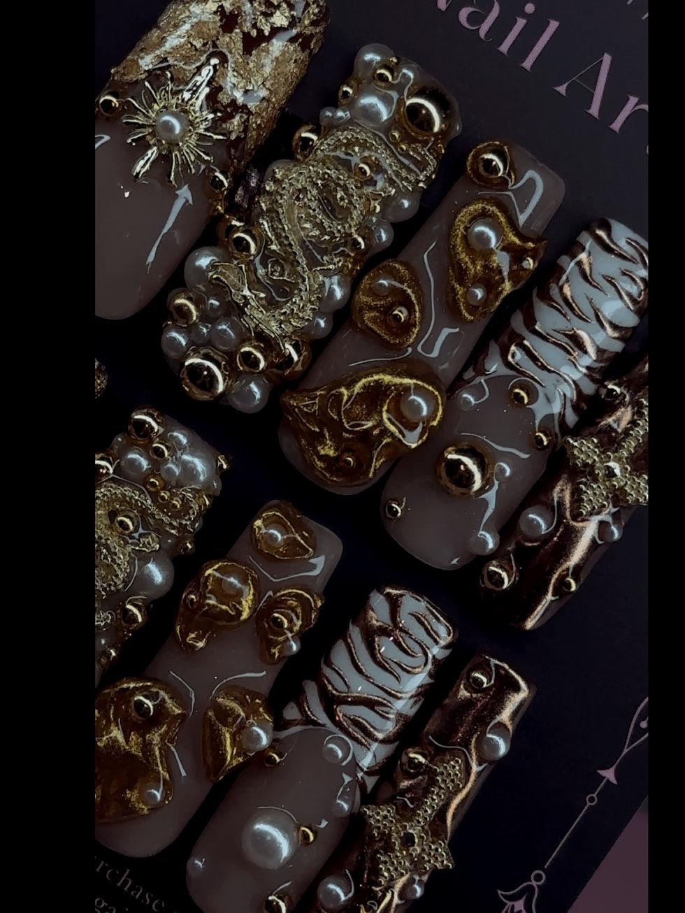 Elevate your style with GOLDEN HOUR from My Site 2. These golden press on nails with 3D art feature a sophisticated white French tip adorned with intricate brown metallic designs, all elegantly embellished with gold and pearls. Perfect for any special occasion, these nails promise a luxurious and dazzling appearance that complements any outfit. Experience the meticulous craftsmanship and luxurious detail that reflects our commitment to quality and beauty. Make a statement with GOLDEN HOUR and enhance your elegance effortlessly.